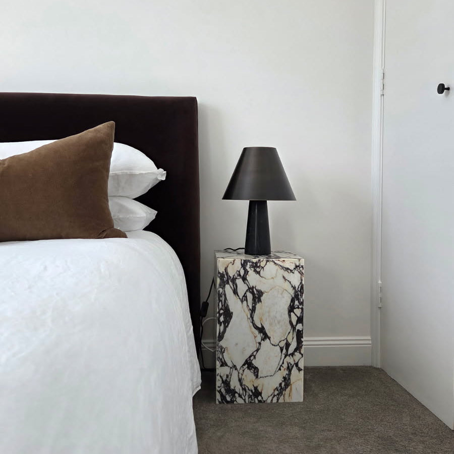 Kozy Nest offers plinths in bold stone finishes, from earthy travertine to striking black Marquina.