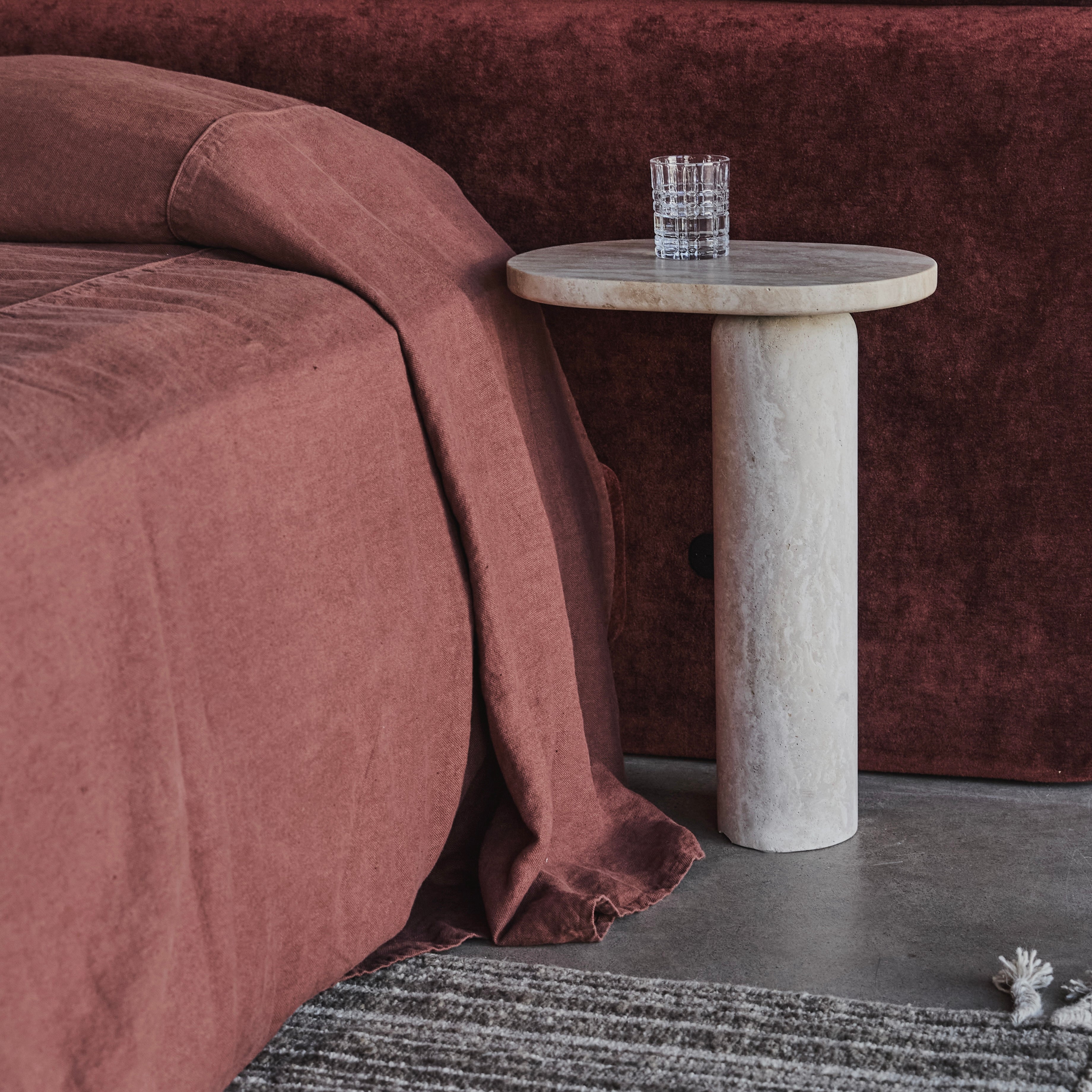 Kozy Nest offers plinths in bold stone finishes, from earthy travertine to striking black Marquina.