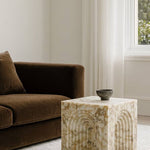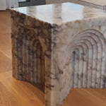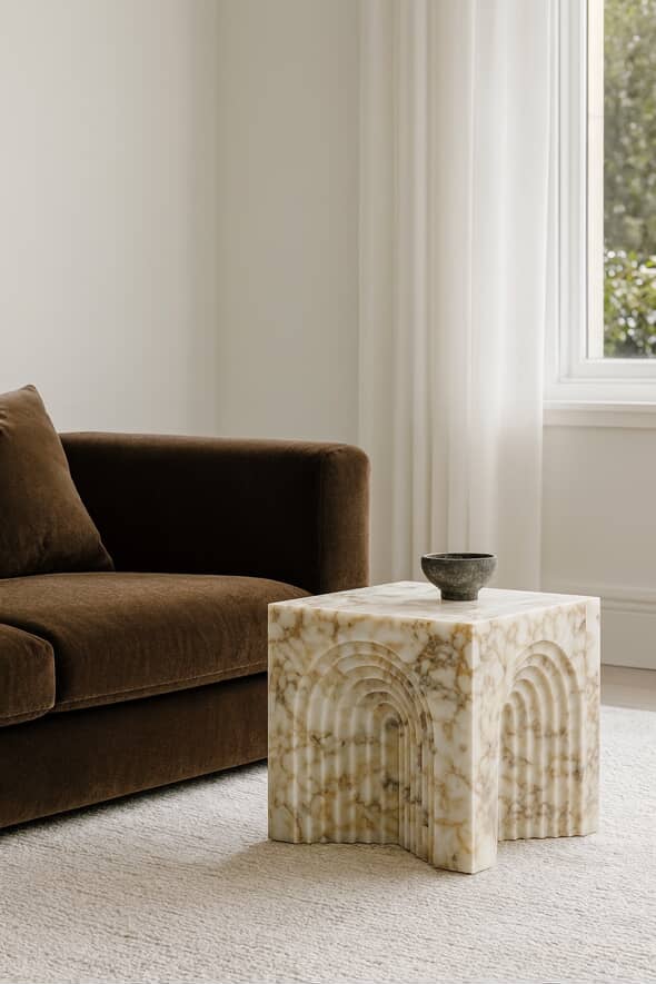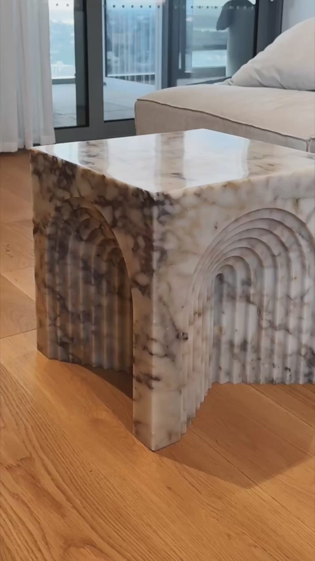 Crafted from luxurious Calacatta Viola marble, the Arco Square Side Table brings architectural elegance into any space. Its sculptural arches and rich veining create a striking balance between art and function.