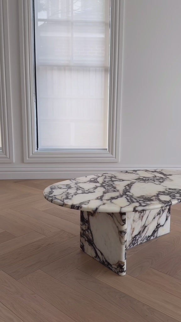 The Verona oval marble table is a Calacatta Viola marble coffee table that brings timeless elegance to your living space. Its luxurious finish and intricate veining make it a showstopper.