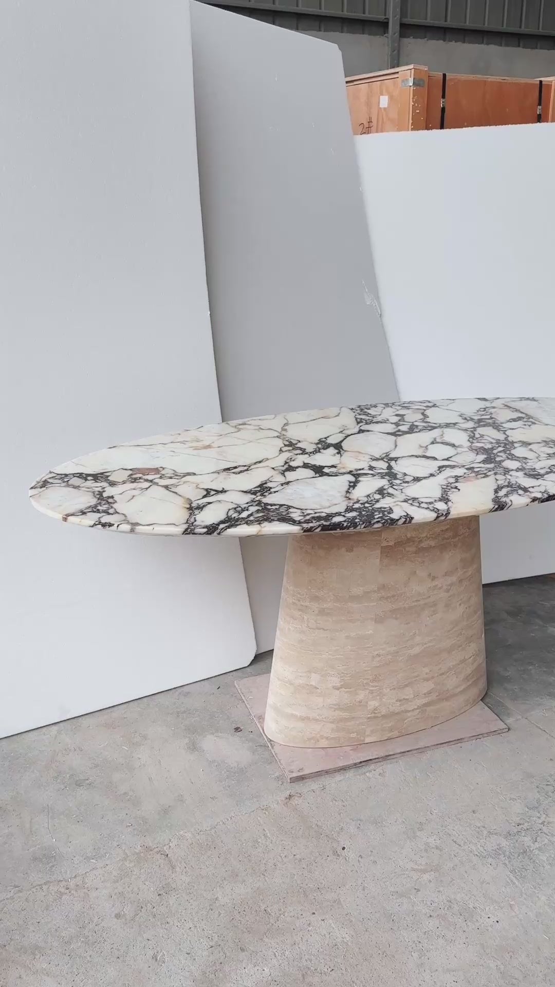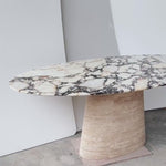 A harmonious blend of timeless elegance and sculptural form, the Eterna oval dining table features a striking Calacatta-style marble top paired with a solid travertine base. The unique veining and natural textures make each piece one of a kind. Sophisticated yet grounded, Eterna is perfect for contemporary interiors seeking a bold, organic statement.