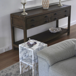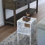 A refined side table sculpted from Arabescato Vagli marble, where soft ivory tones meet bold, natural veining in shades of gold and charcoal. Its open shelf design adds functional elegance, perfect for storing your evening reads or decorative accents. With a honed finish that enhances the stone’s luxurious texture, this piece brings effortless sophistication to any bedside or lounge setting.