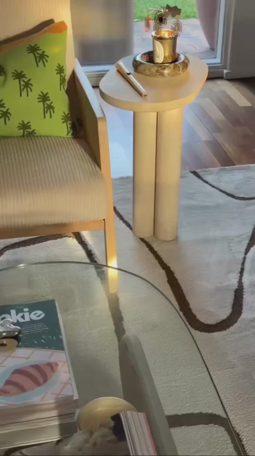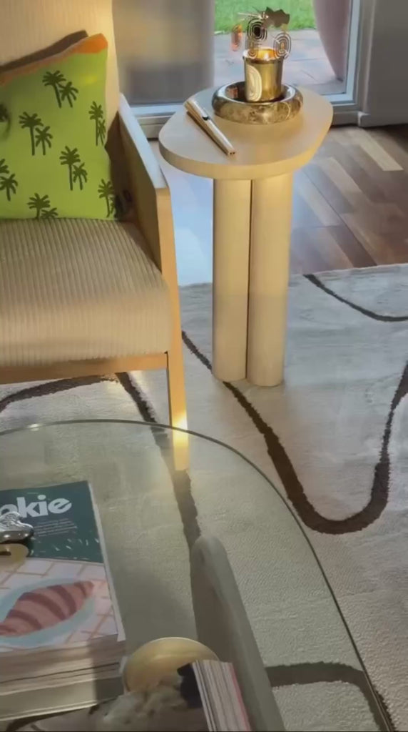 The Trio Travertine Stone Side Table showcases timeless elegance with its natural stone construction, the three sculptural columns provide a sturdy, yet artistic base, blending form and function.