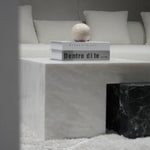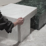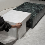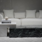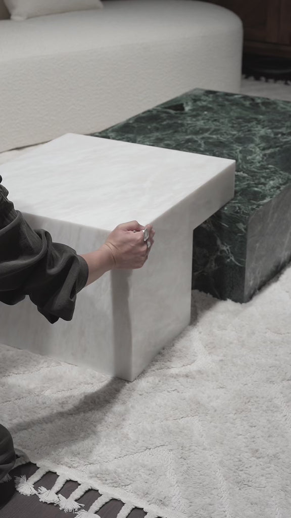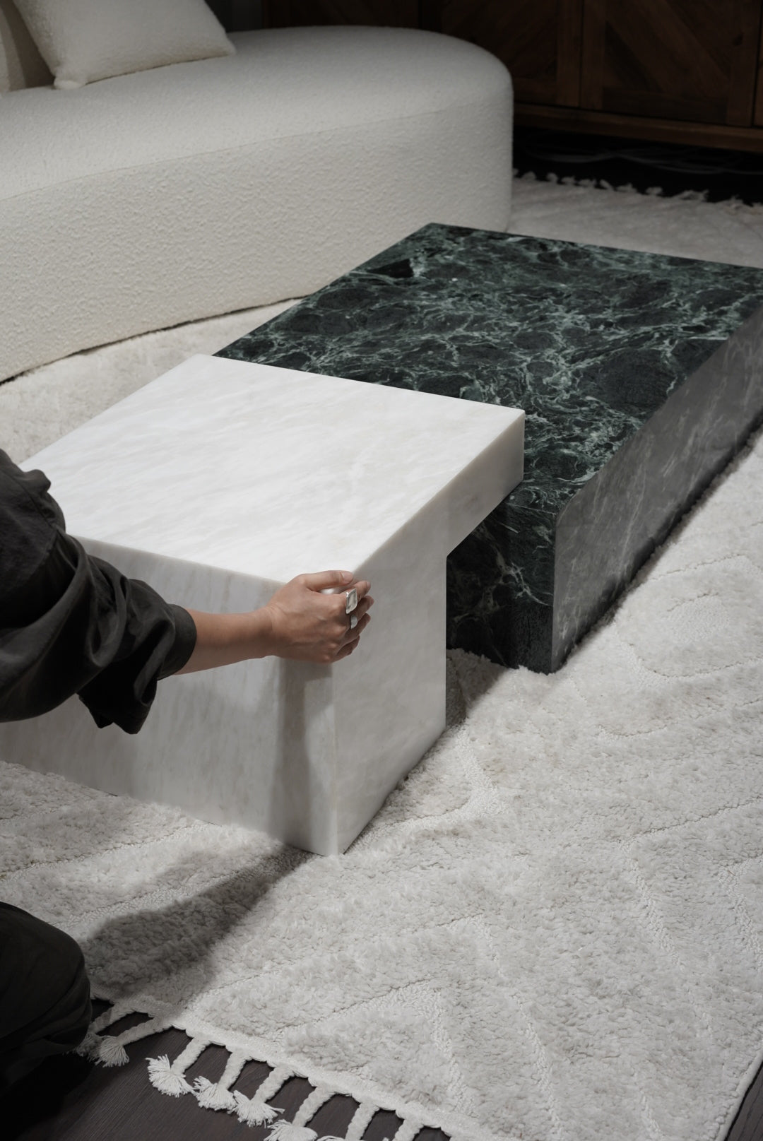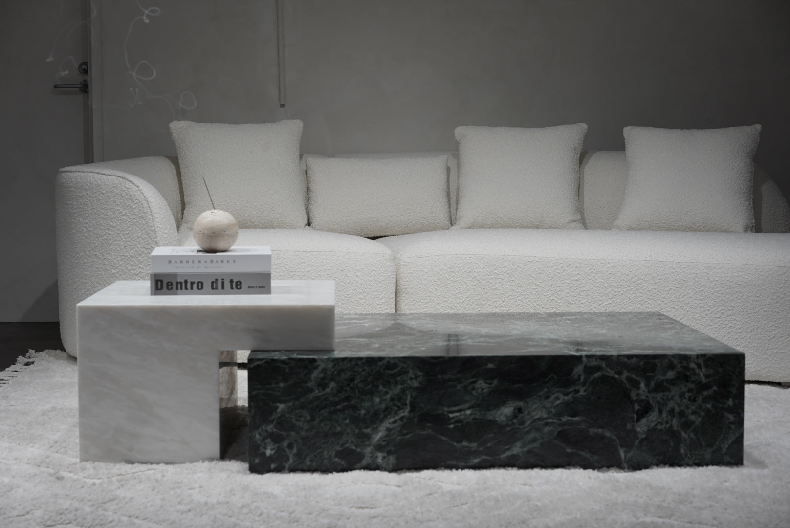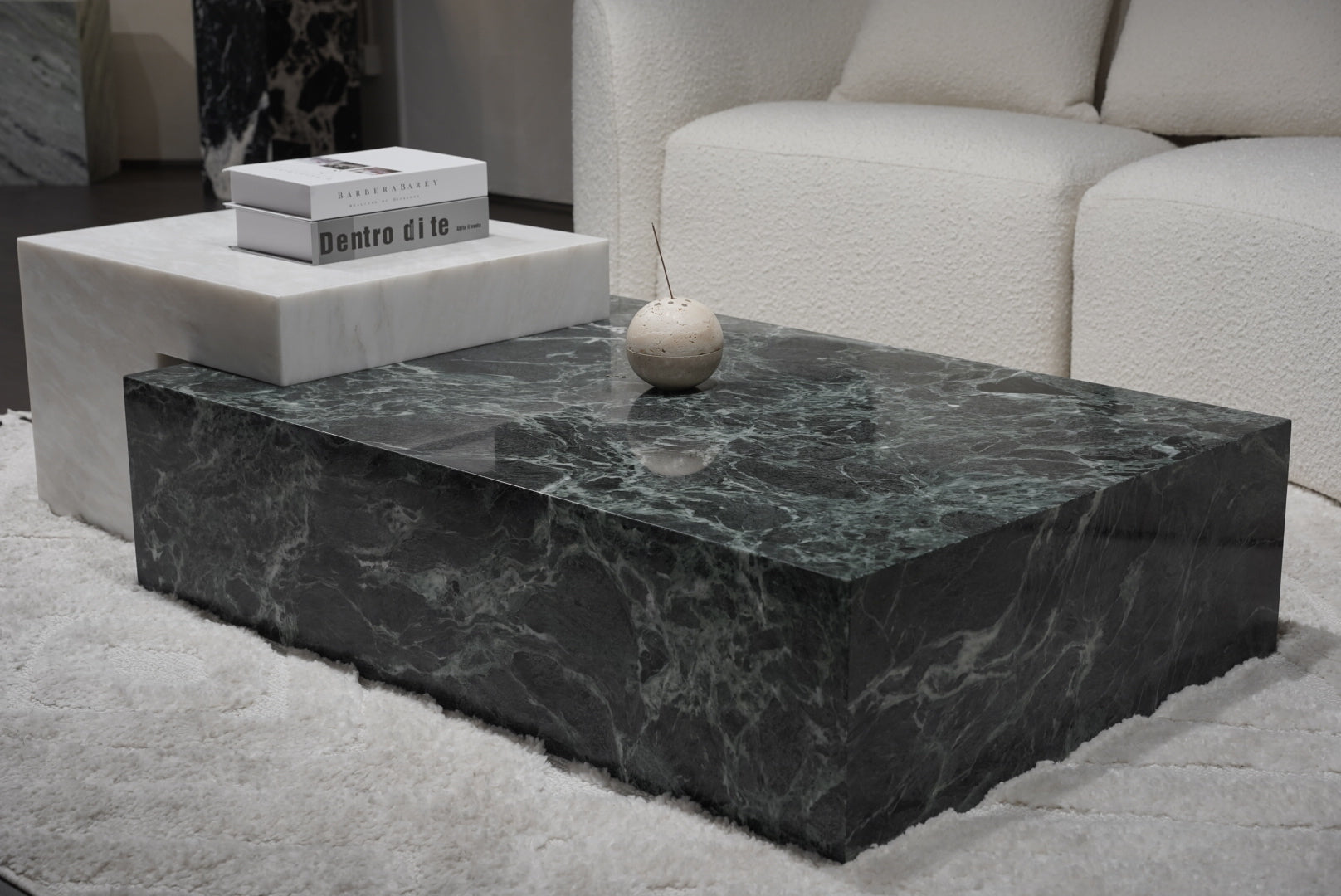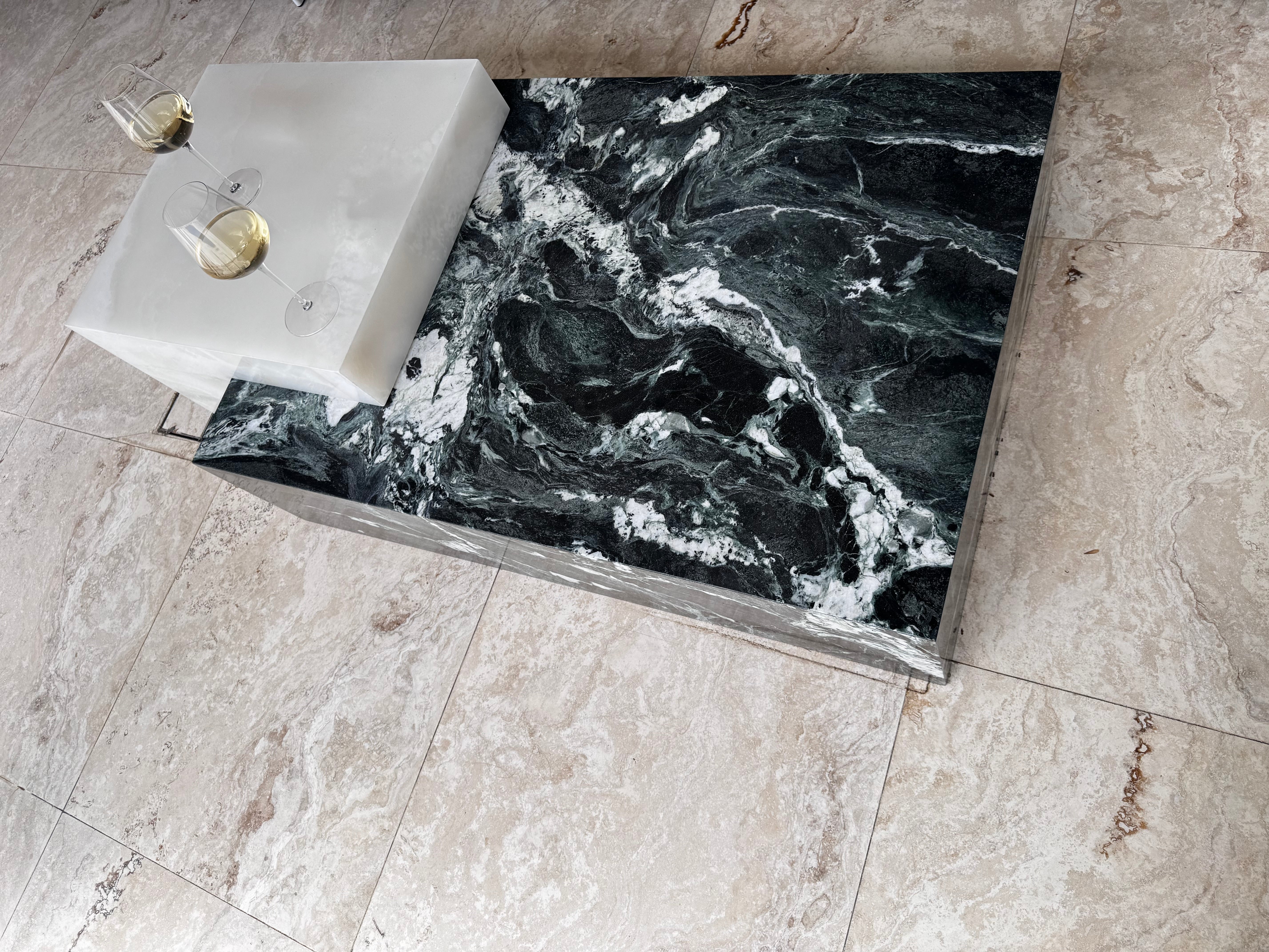 This two-tone marble table pairs Verdi Alpi Green with White Onyx, creating a bold yet balanced coffee centerpiece.