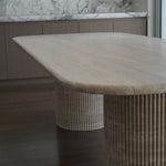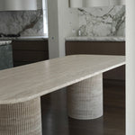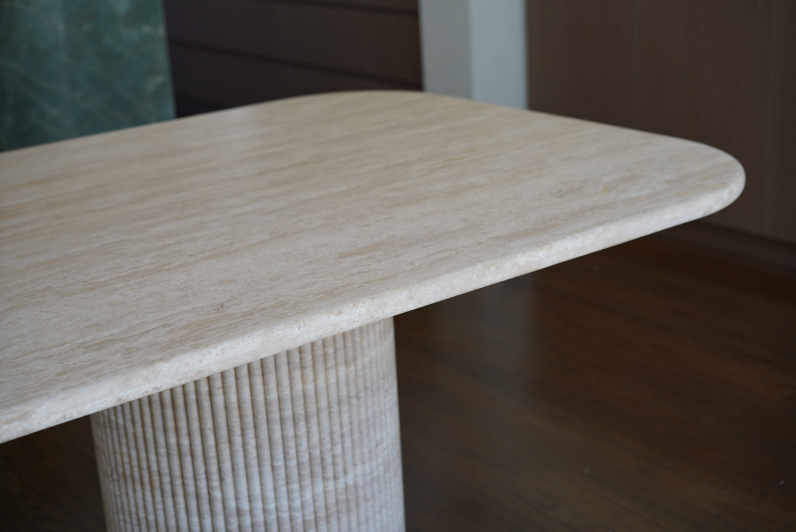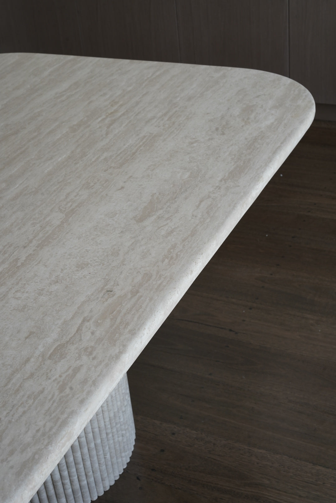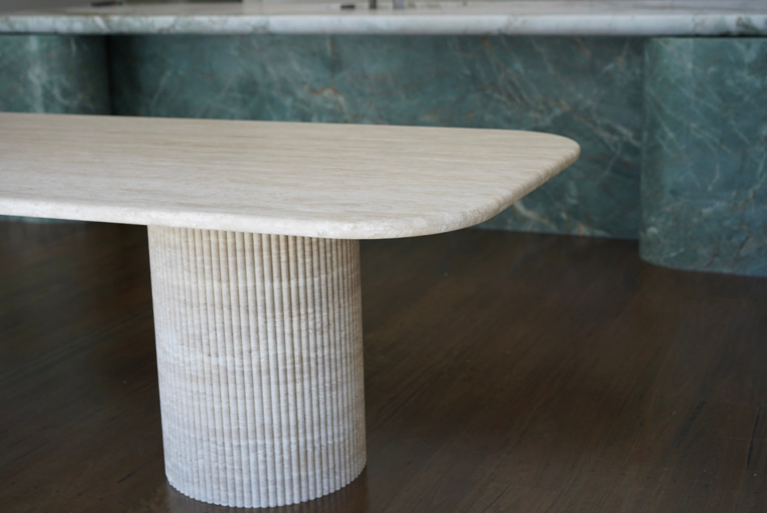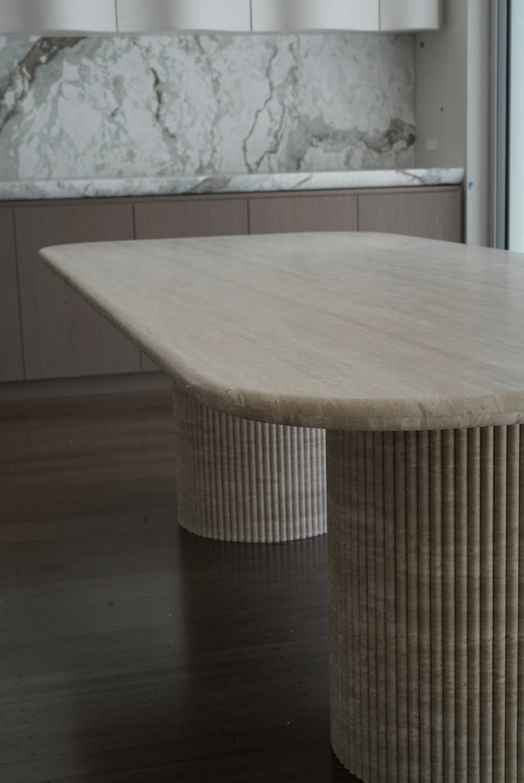 This table celebrates timeless design through its soft curved edges, generous slab top, and two fluted column legs that bring depth, texture, and architectural elegance into any dining space.