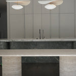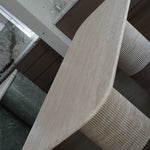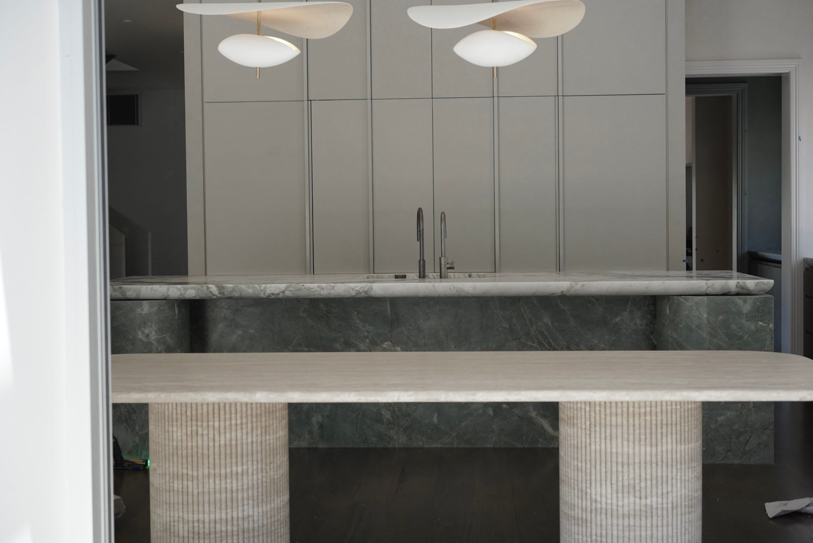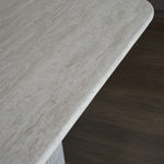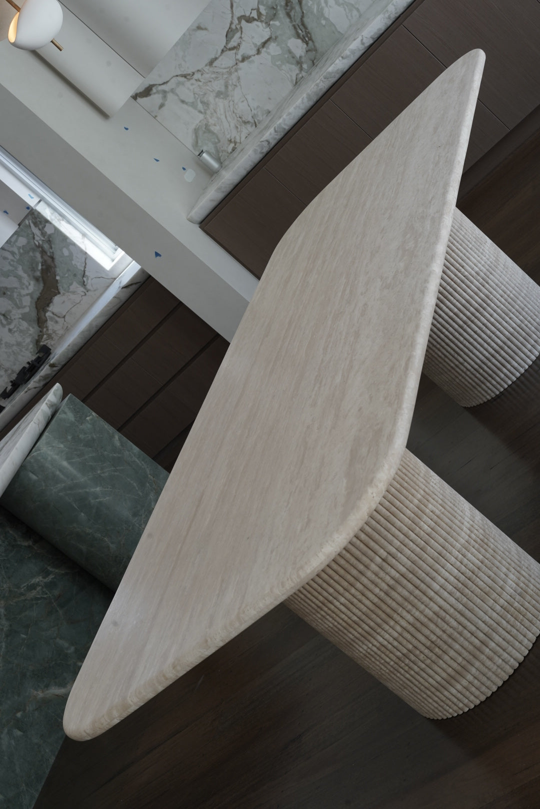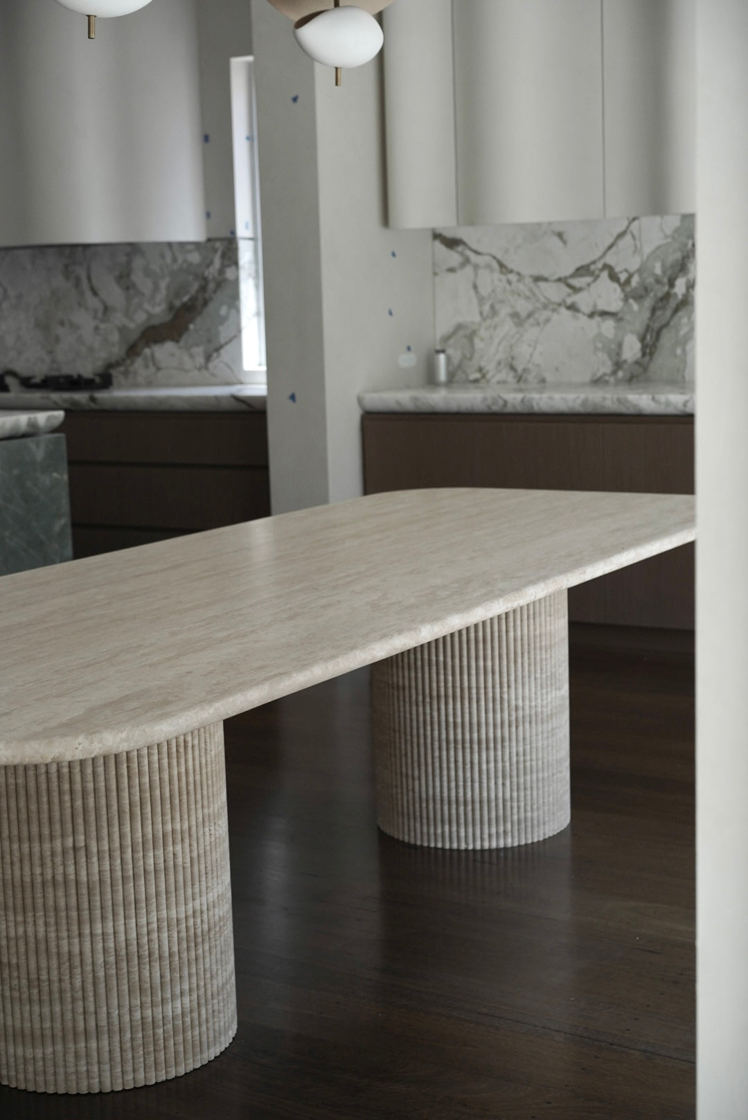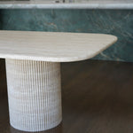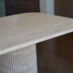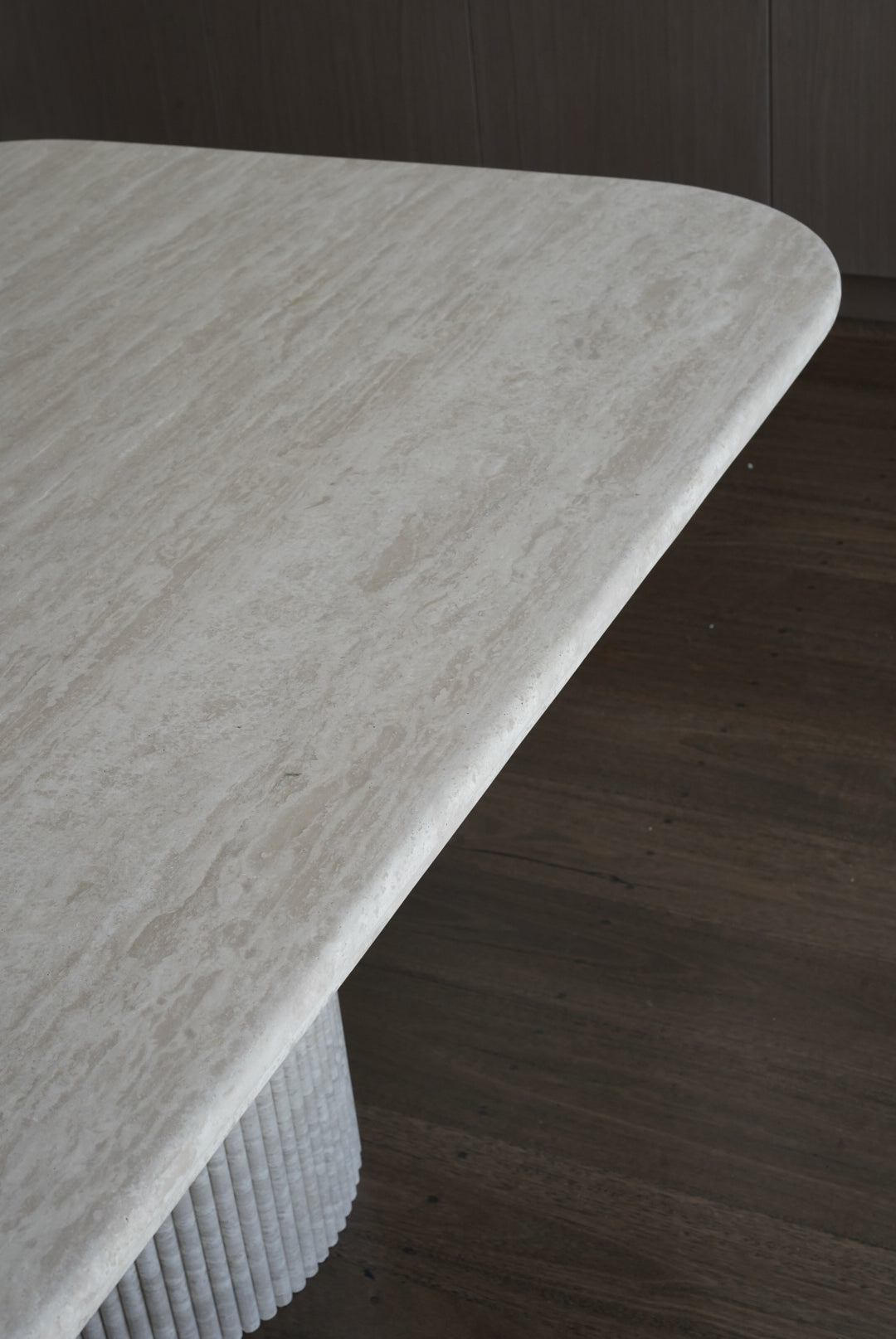 This table celebrates timeless design through its soft curved edges, generous slab top, and two fluted column legs that bring depth, texture, and architectural elegance into any dining space.