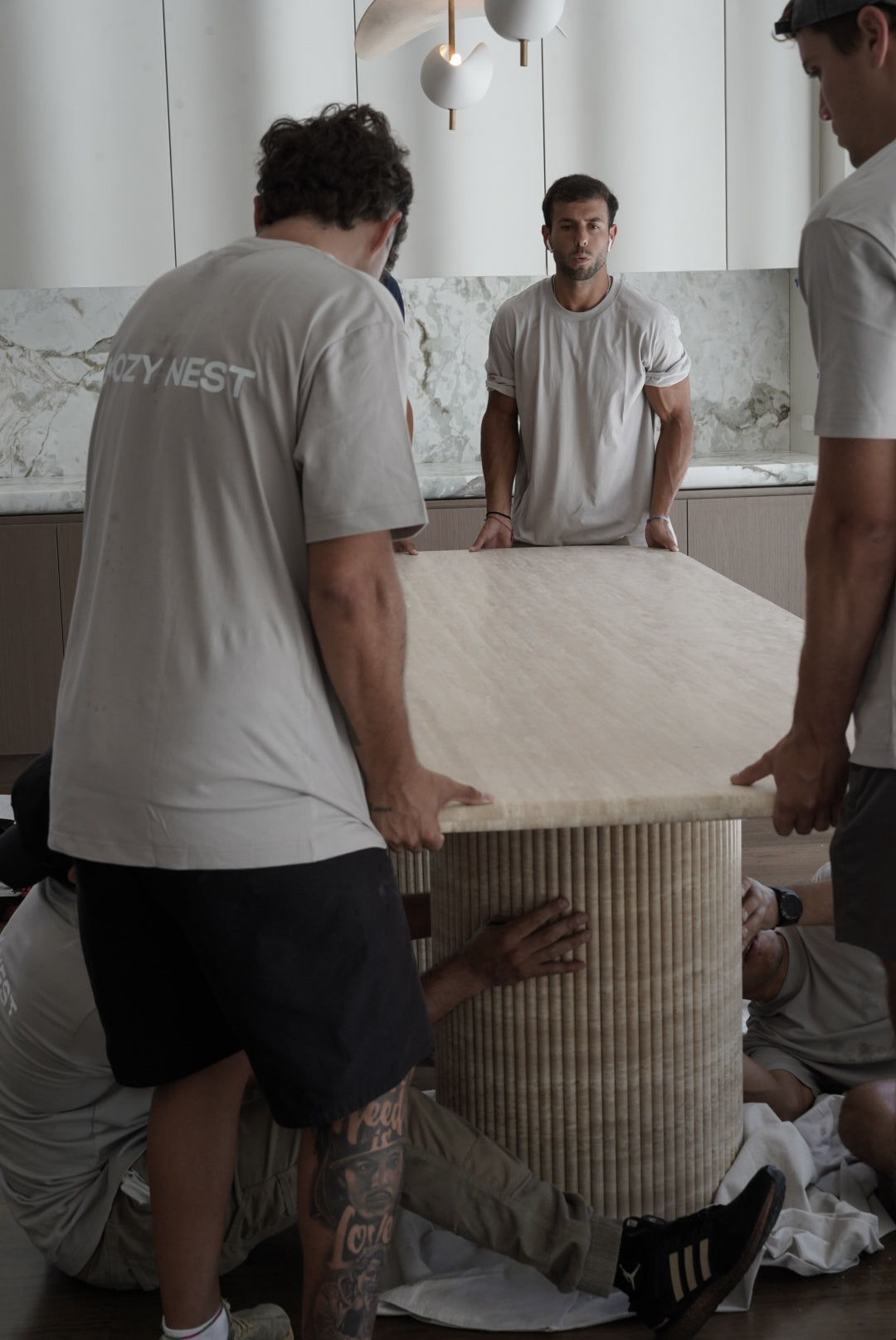 Introducing the Aster Travertine Dining Table,a sculptural statement piece crafted from premium natural travertine.