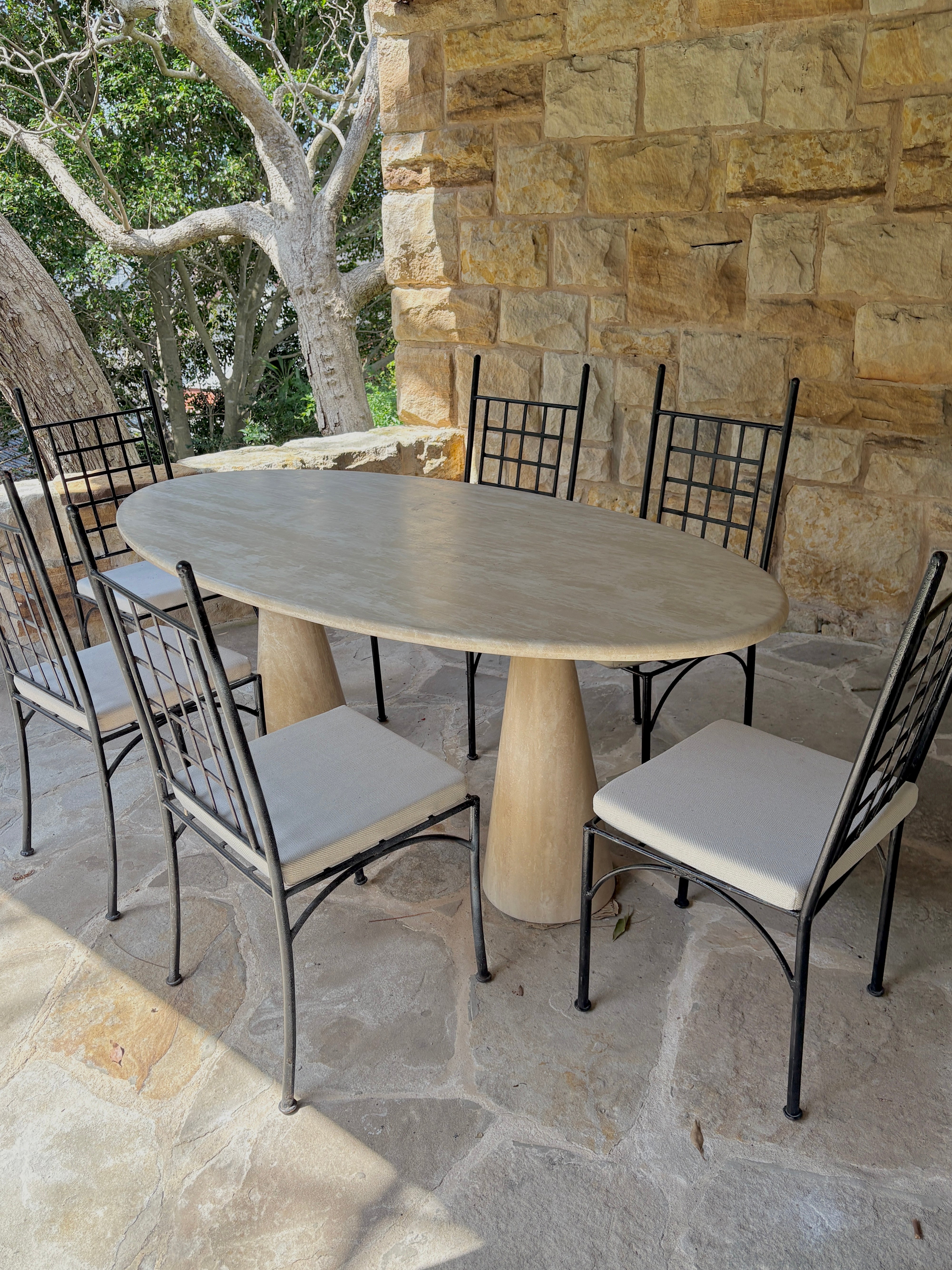Crafted from exquisite travertine, this oval dining table exudes a natural elegance with its unique veining and soft, earthy tones.