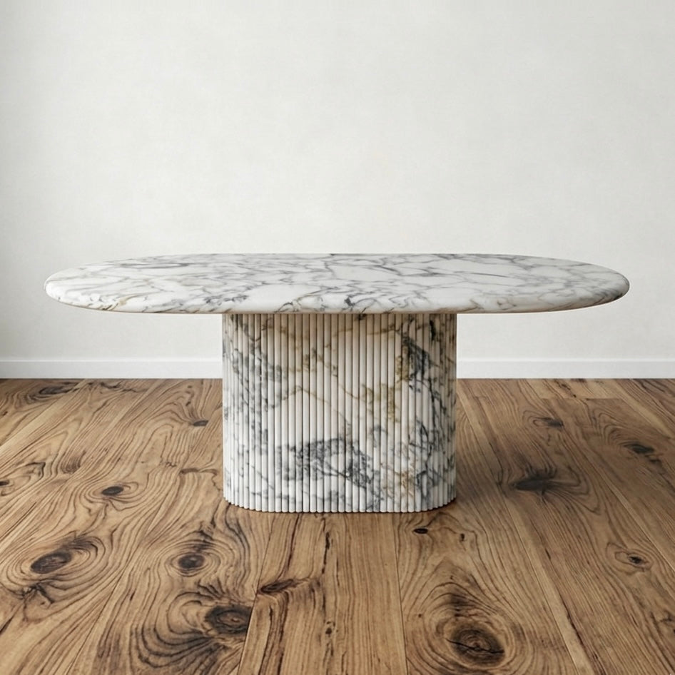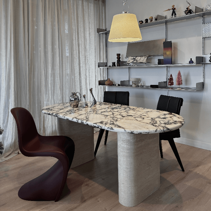 Each piece in our curated collection is handcrafted using premium marble varieties, including Calacatta Viola, Travertine, Arabescato, and Bianco Carrara. These materials are chosen not just for their beauty, but for their strength, longevity, and individual character. No two slabs are alike, ensuring your table is truly one-of-a-kind.