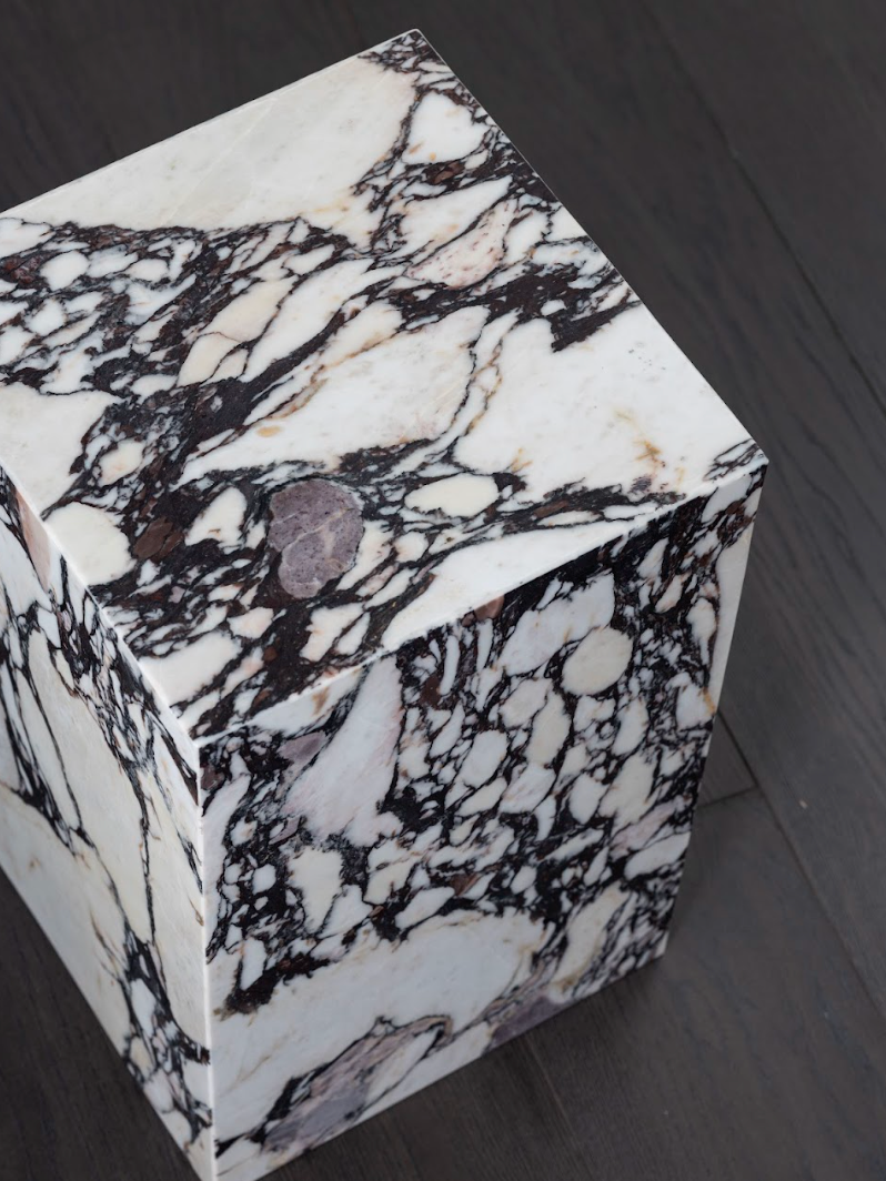 The Celestia marble plinth table showcases the dramatic beauty of Calacatta Viola marble. With its sculptural form and rich veining, this marble table is perfect for modern interiors seeking a touch of timeless opulence.