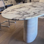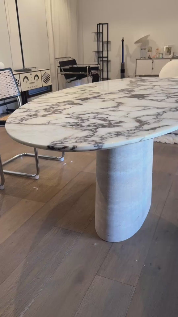 A harmonious blend of timeless elegance and sculptural form, the Eterna oval dining table features a striking Calacatta-style marble top paired with a solid travertine base. The unique veining and natural textures make each piece one of a kind. Sophisticated yet grounded, Eterna is perfect for contemporary interiors seeking a bold, organic statement.