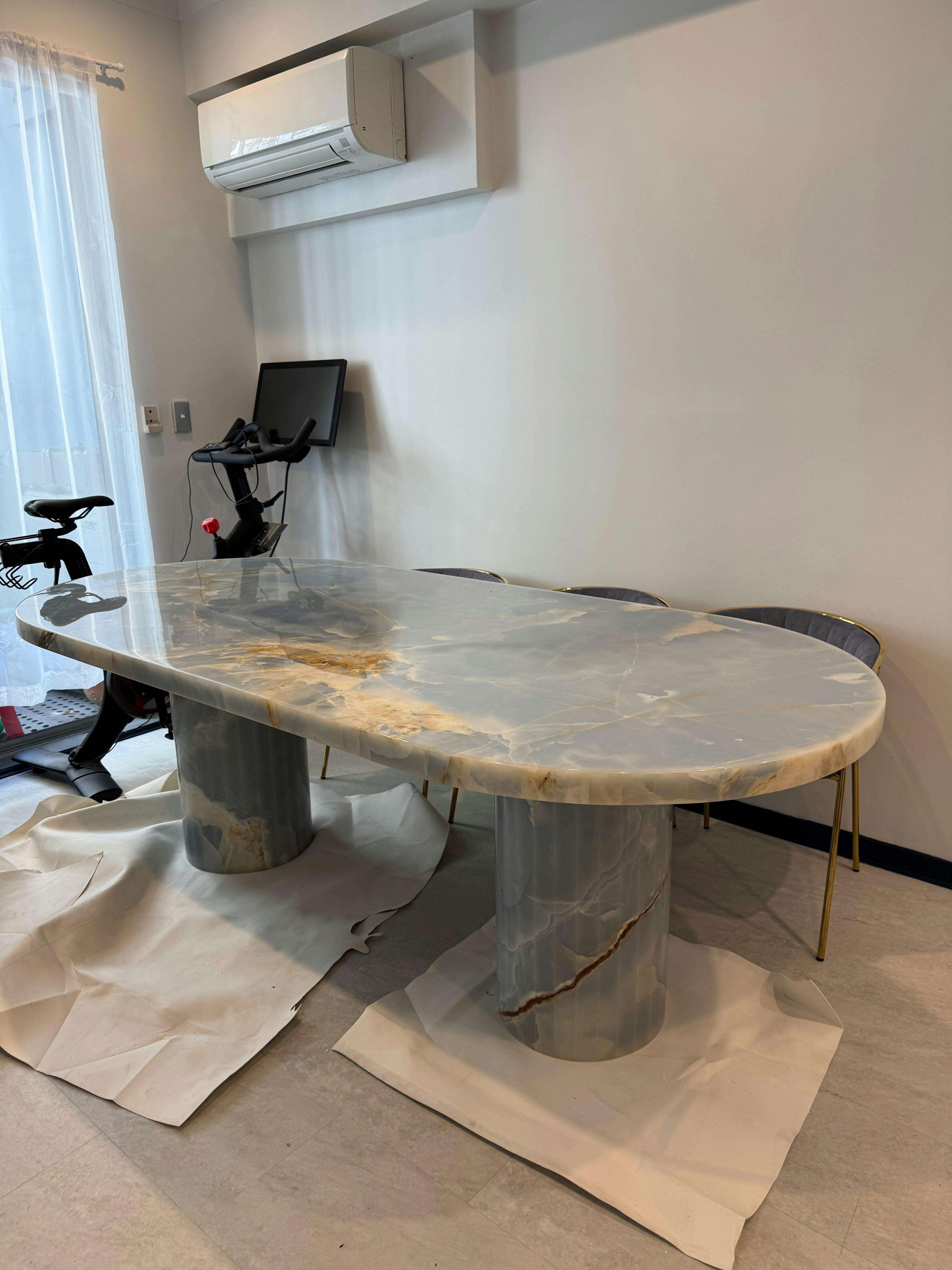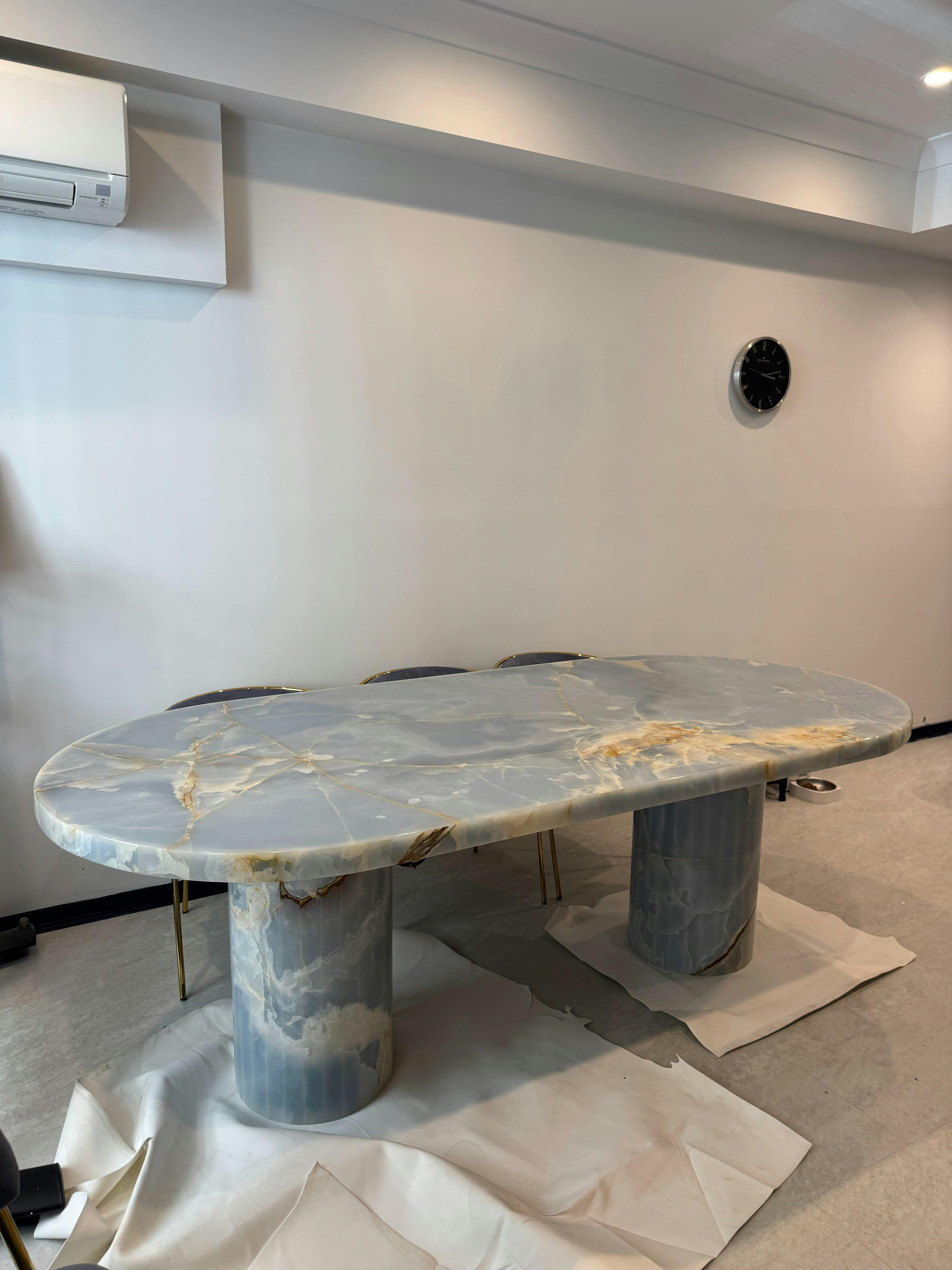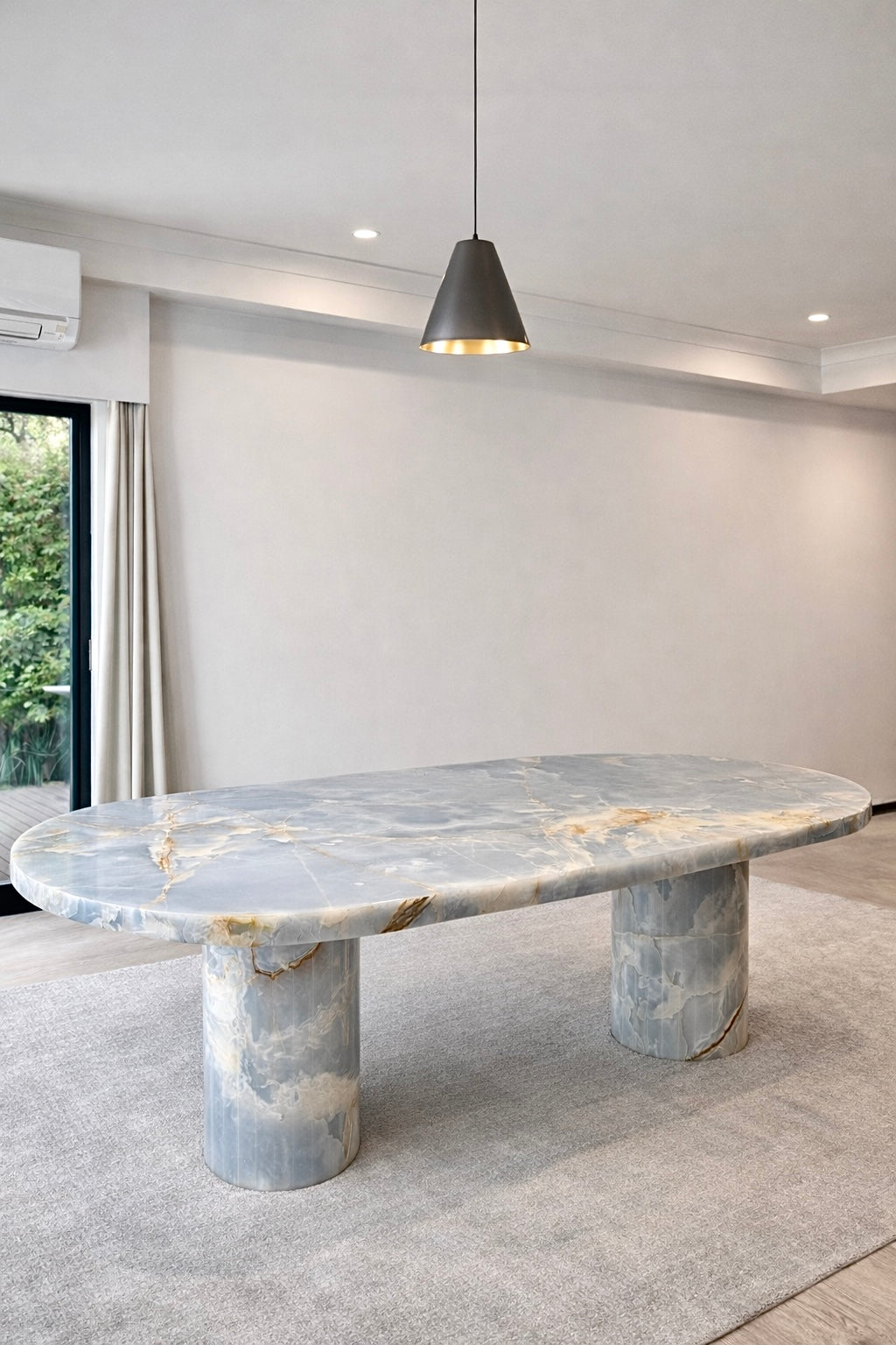 A breathtaking statement piece in rare Blue Onyx, this dining table brings sculptural elegance to any interior. The natural stone features soft cloud-like blues with subtle honey and ivory veining.