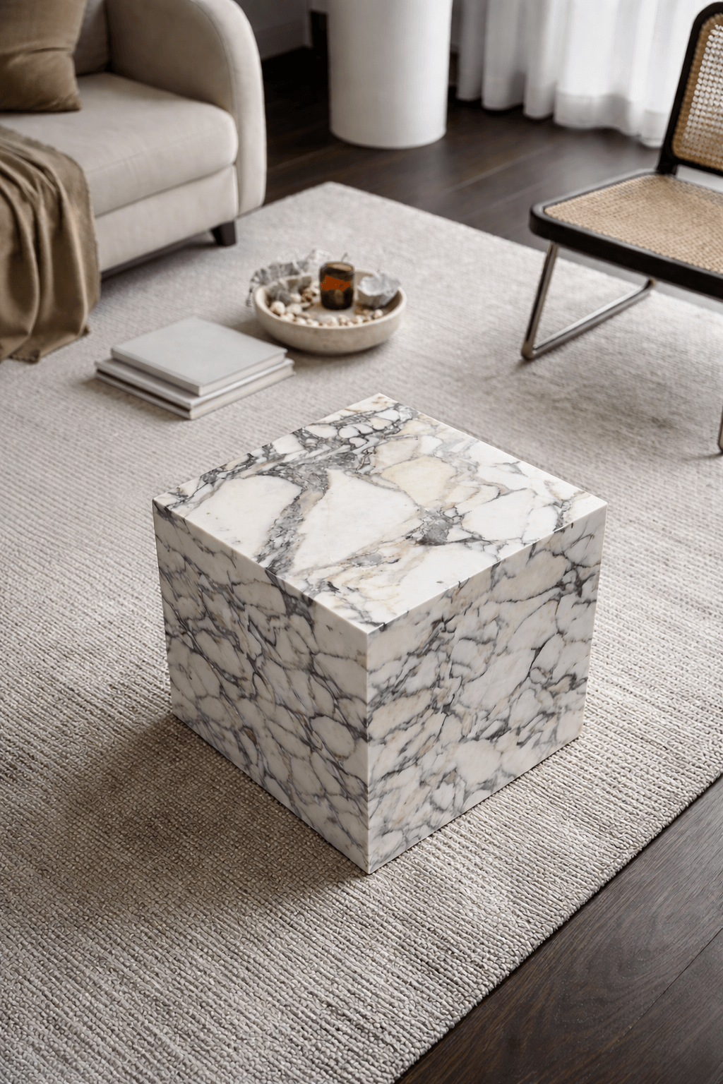 Monet Cube is a sculptural statement piece crafted from premium natural Italian Calacatta Monet marble, known for its expressive veining and soft, painterly contrast.
