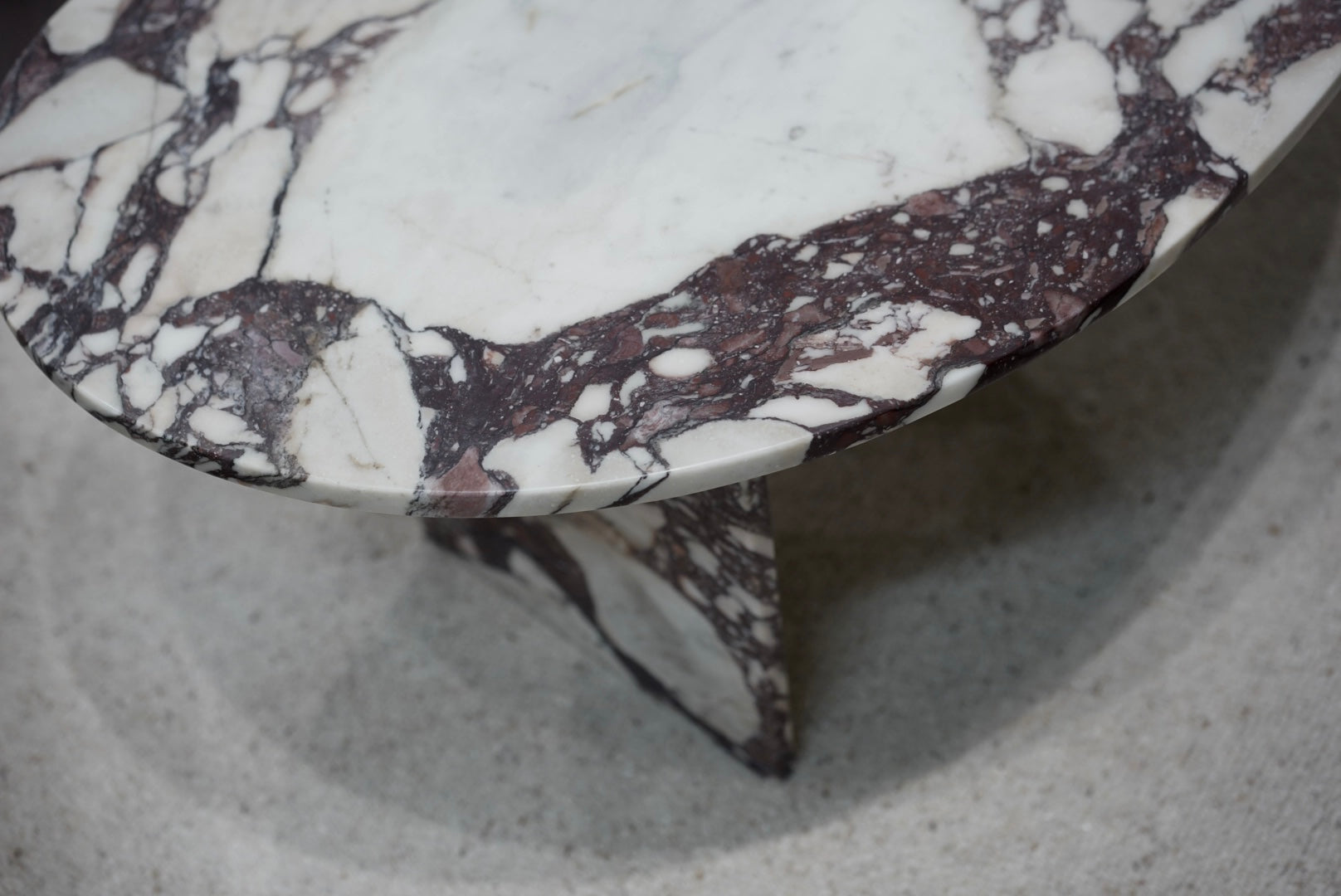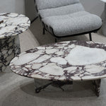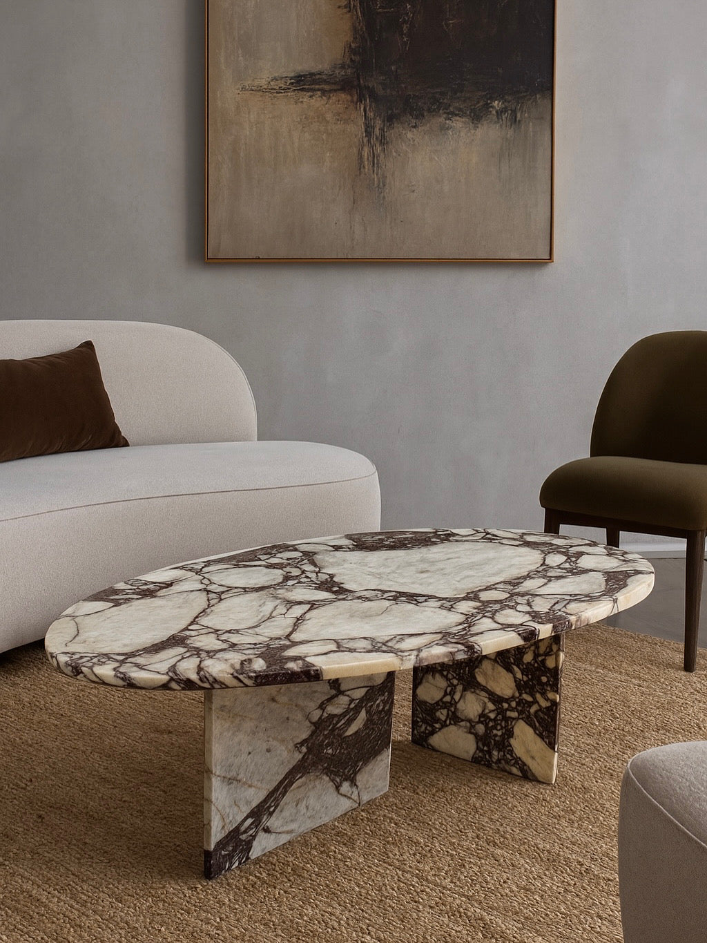 This egg-shaped coffee table is a true statement of design. Crafted from exquisite Italian Calacatta Viola marble, its rare purple veining becomes the highlight, making each piece a one-of-a-kind work of art.