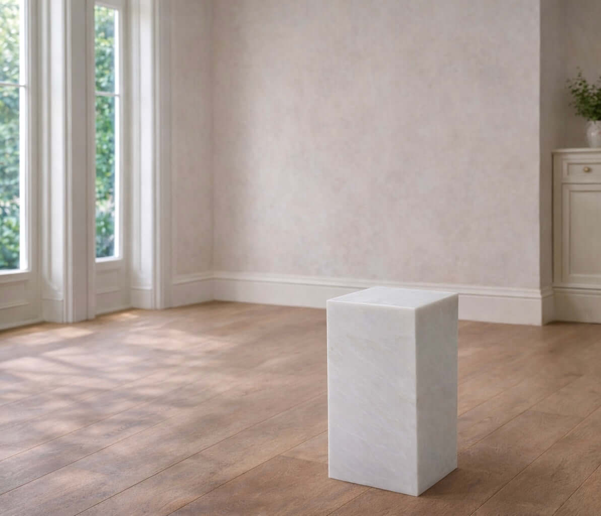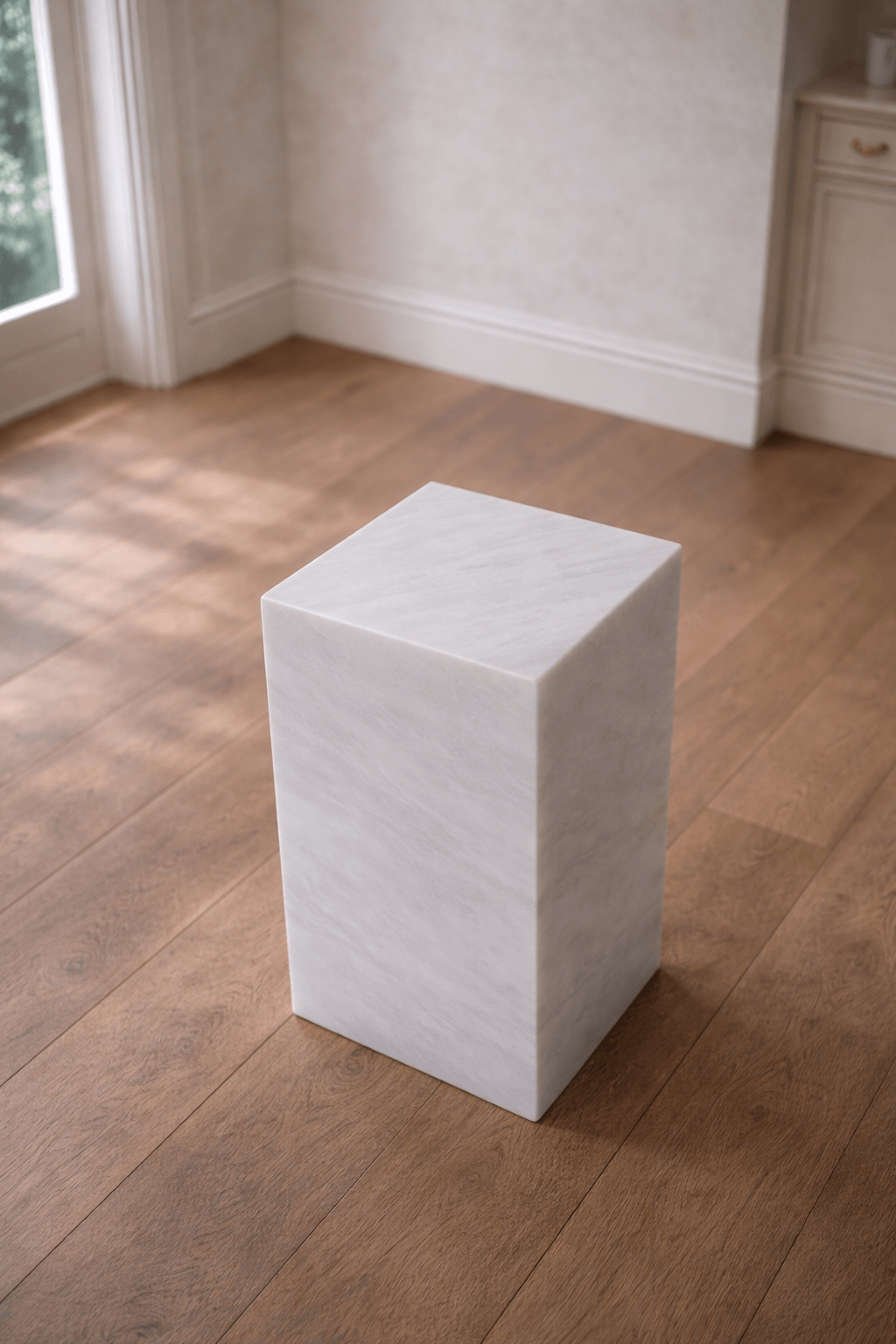 Kari Ice Jade White Marble Plinth is a refined statement piece crafted from natural Ice Jade stone, celebrated for its soft translucency and calm, milky-white tone.