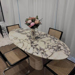 A harmonious blend of timeless elegance and sculptural form, the Eterna oval dining table features a striking Calacatta-style marble top paired with a solid travertine base. The unique veining and natural textures make each piece one of a kind. Sophisticated yet grounded, Eterna is perfect for contemporary interiors seeking a bold, organic statement.