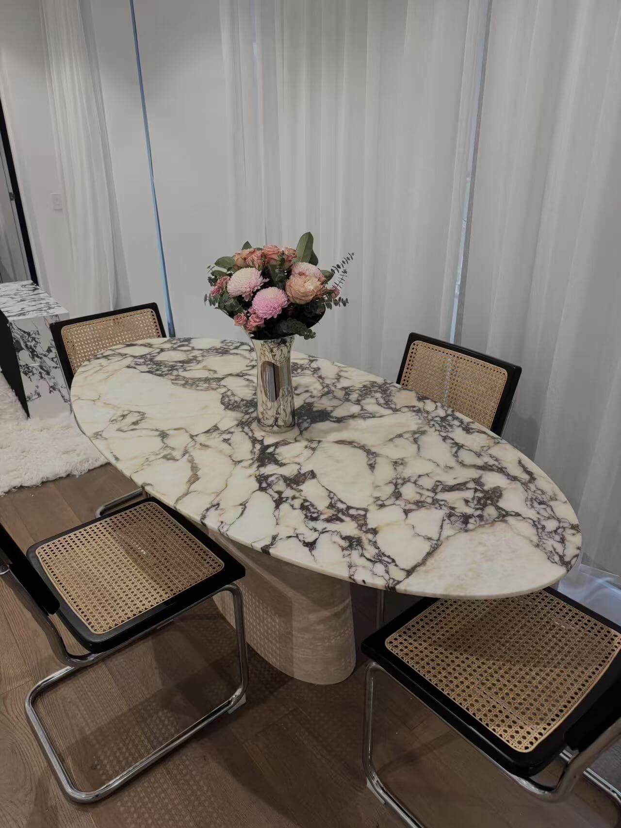 A harmonious blend of timeless elegance and sculptural form, the Eterna oval dining table features a striking Calacatta-style marble top paired with a solid travertine base. The unique veining and natural textures make each piece one of a kind. Sophisticated yet grounded, Eterna is perfect for contemporary interiors seeking a bold, organic statement.