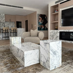 I paired this coffee table with two small plinths because my mum's living room is quite large. It feels like a puzzle. You can play around with the layout. The Italian marble is premium.