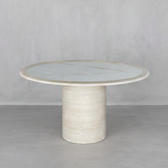Crafted from white onyx and travertine, it speaks through texture and light.