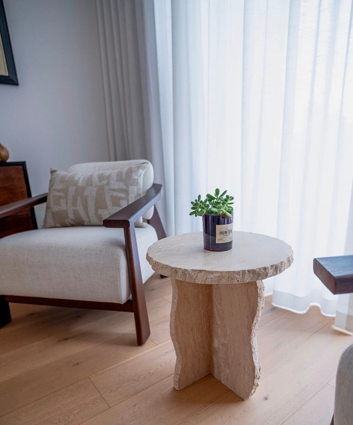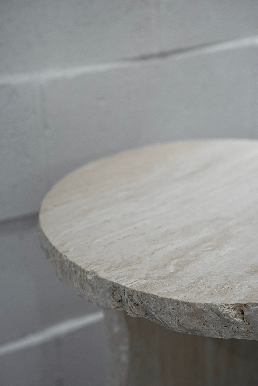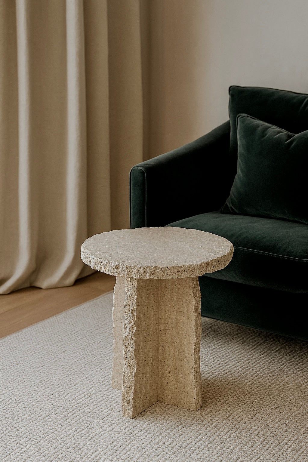 Handmade from solid travertine, each piece features uniquely chiseled edges and a sculptural form that highlights the organic character of the stone.