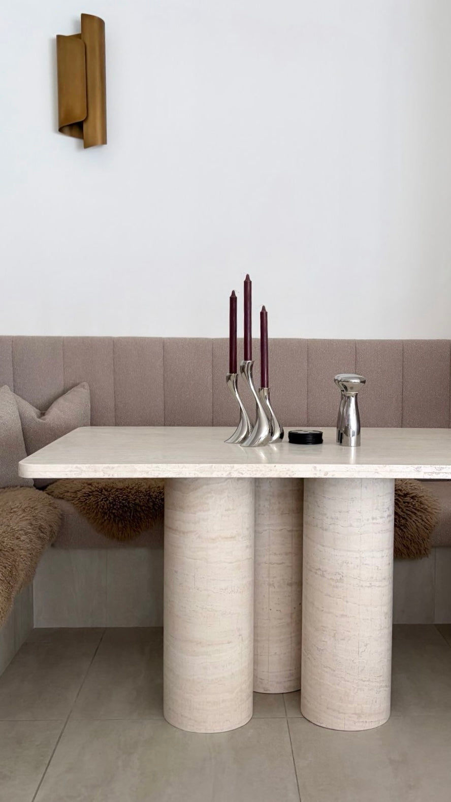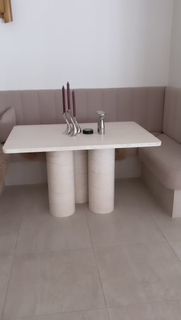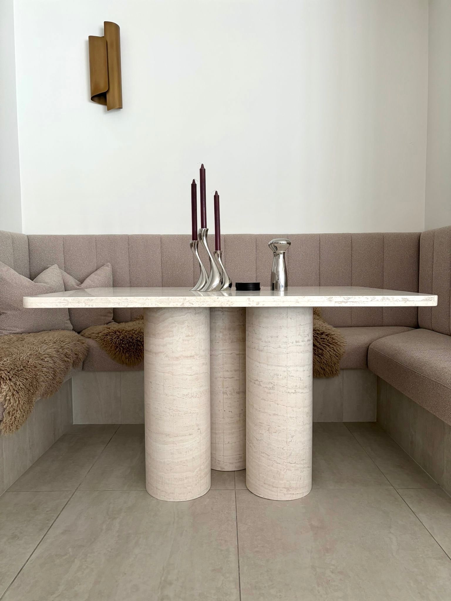 The Aurelia Travertine Dining Table is a celebration of timeless stone and architectural balance.