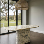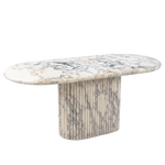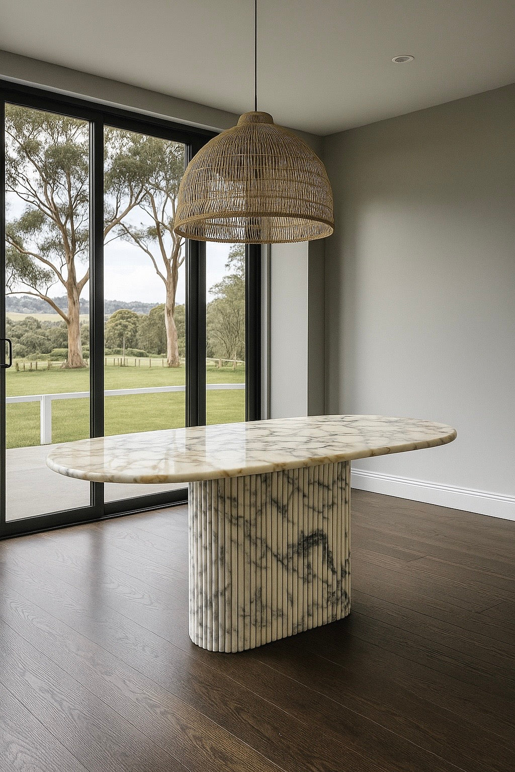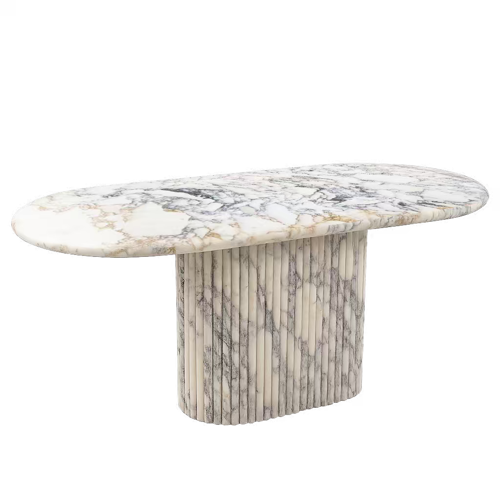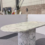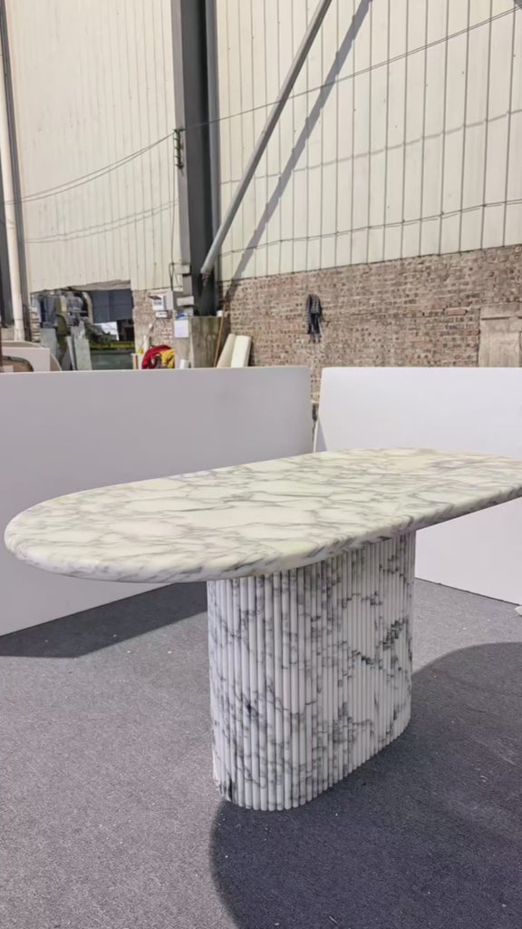 A statement of elegance and craftsmanship. The Arabescato Grace Dining Table features a sleek oval top resting on a sculptural fluted marble base, creating a perfect balance between softness and structure.