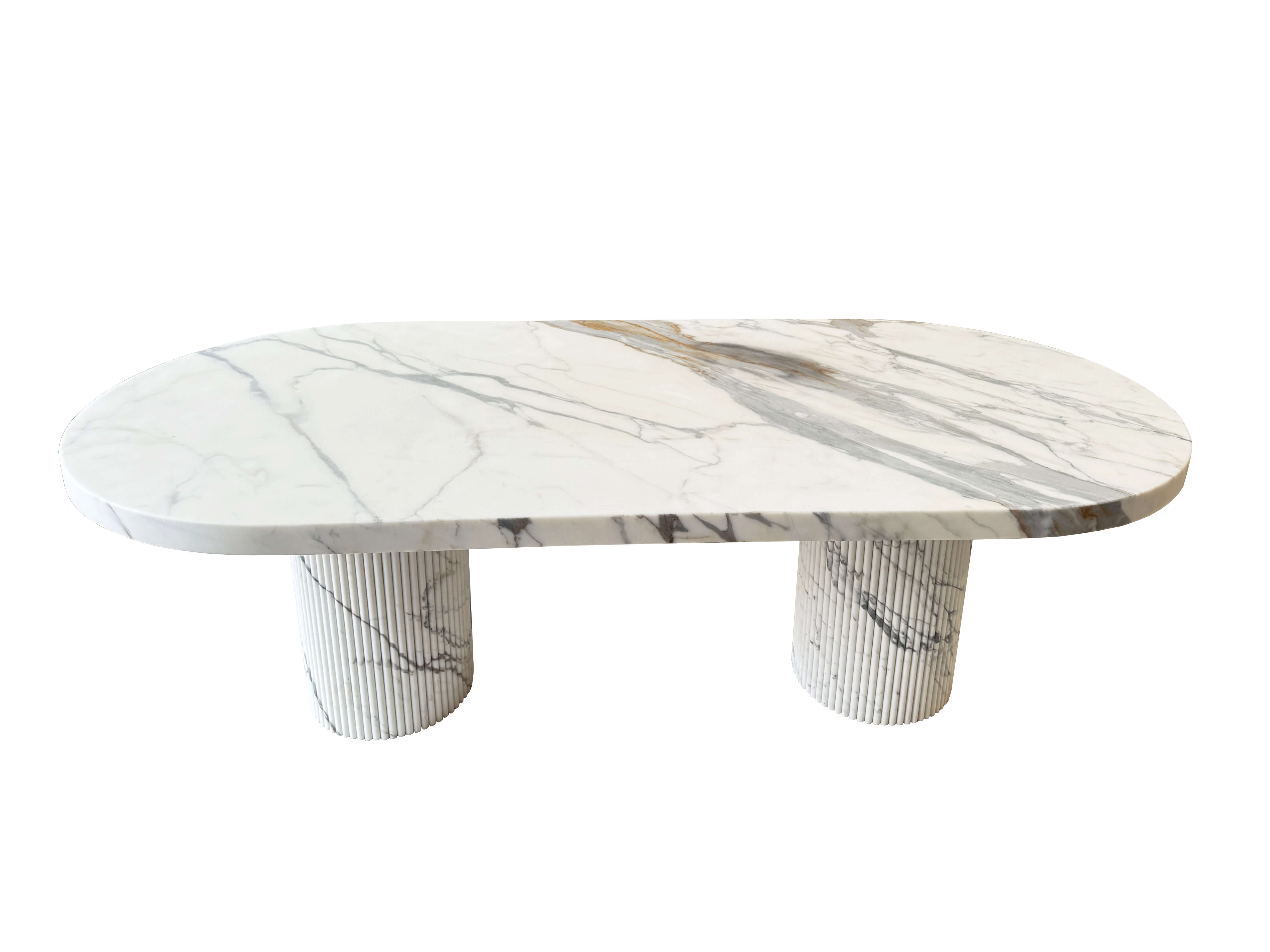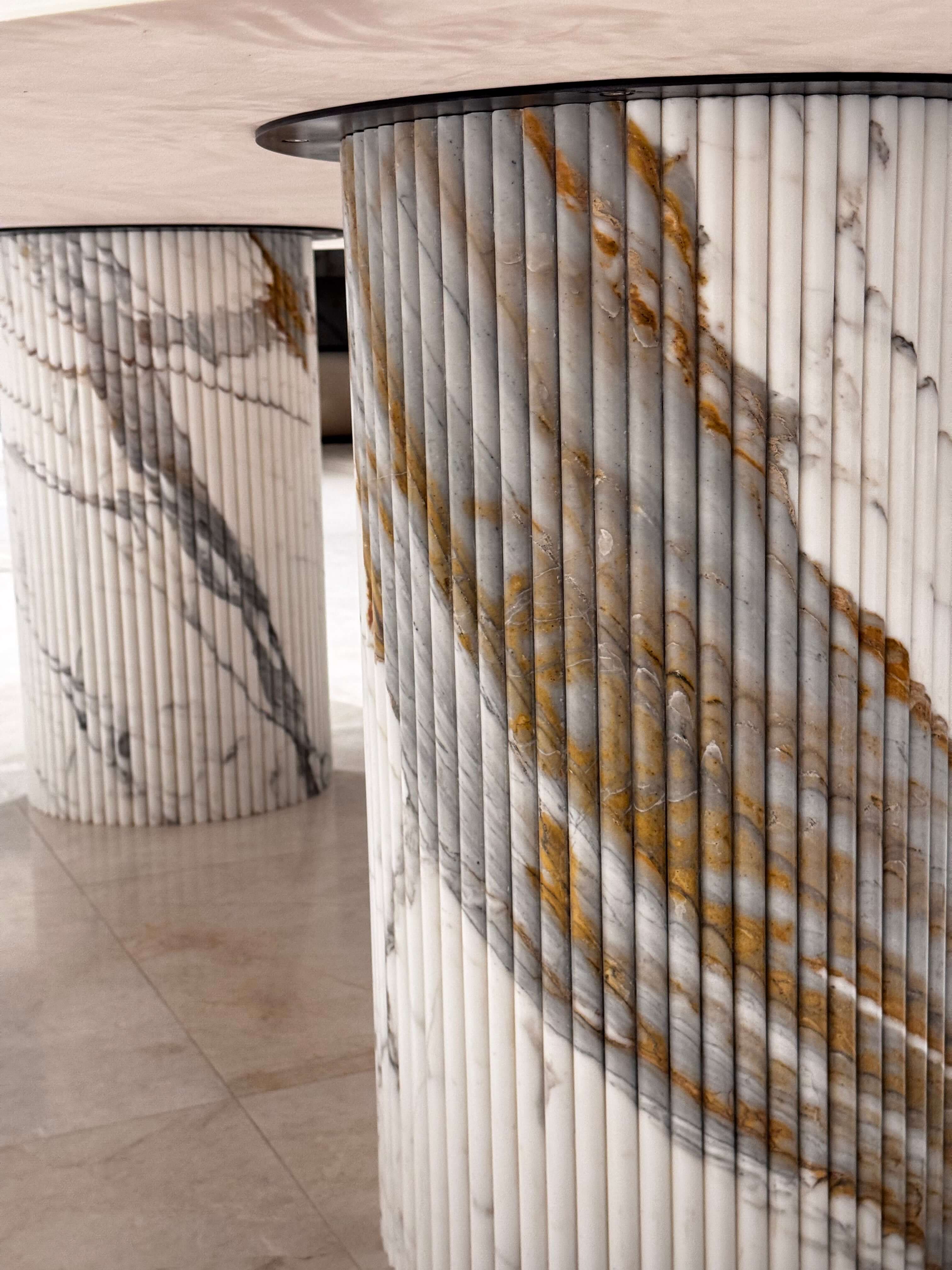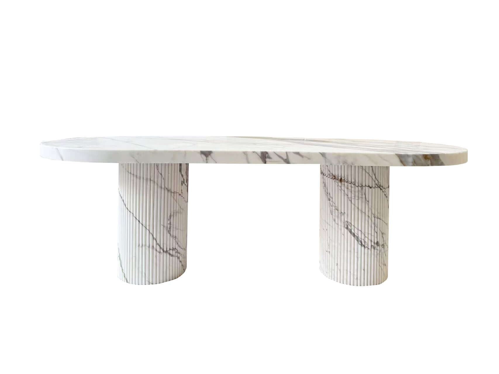 Supported by two elegantly fluted cylindrical bases, it combines sturdy construction with a contemporary aesthetic, making it a standout piece for modern interiors.