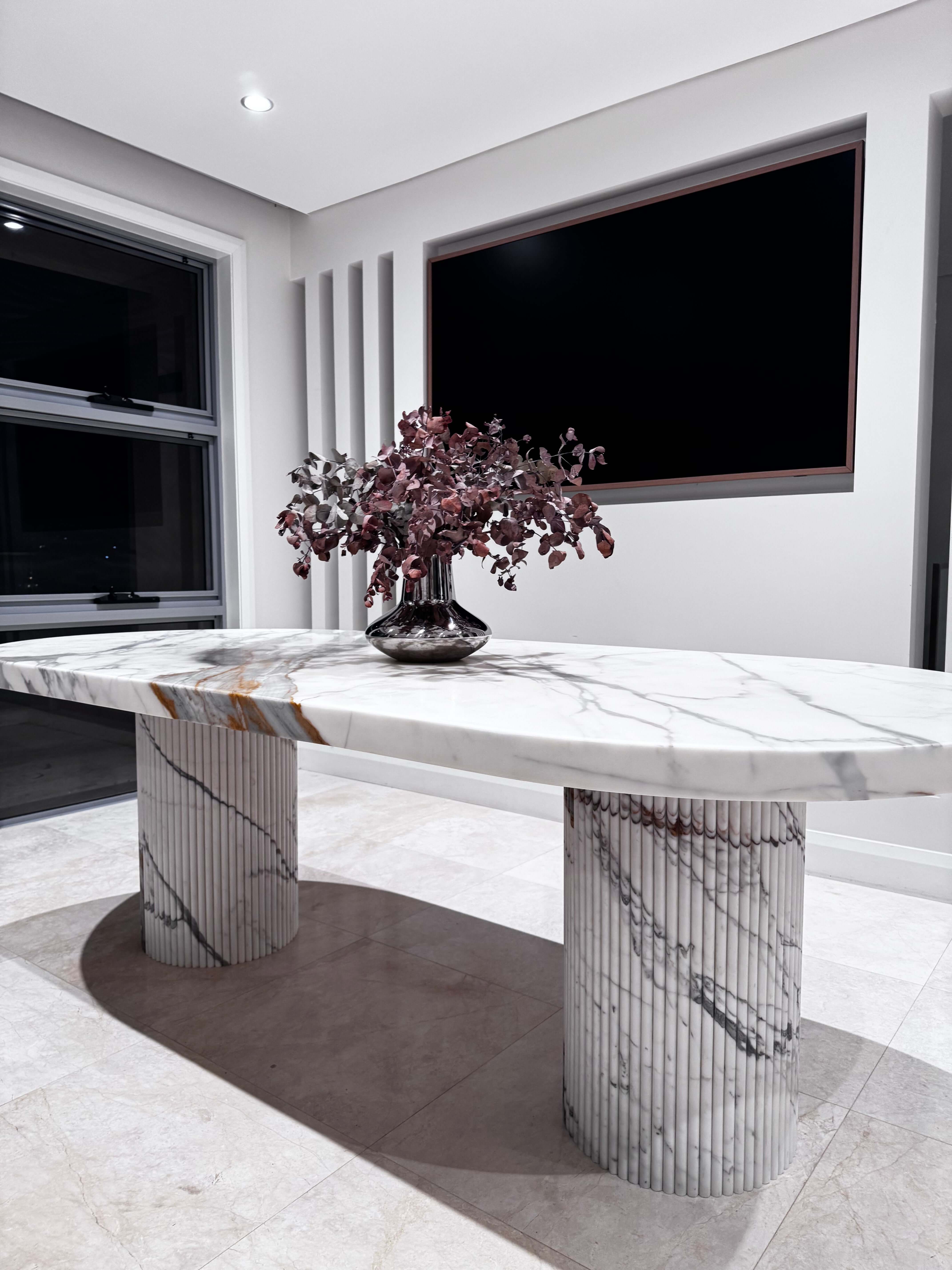 Designed for luxurious dining experiences, the Marbella marble dining table is crafted from Cararra marble, offering a sleek, polished surface with elegant veining. A stunning addition to any dining space.